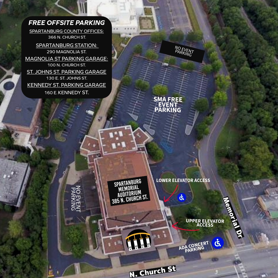 Address for Navigation Systems: Spartanburg Memorial Auditorium, 385 North Church Street, Spartanburg, South Carolina 29303